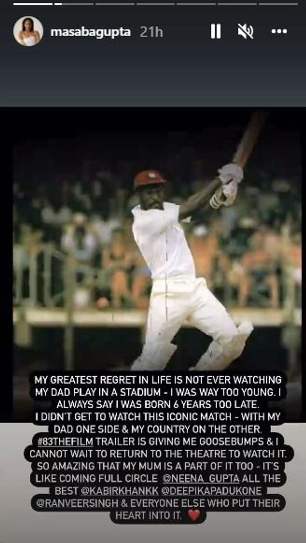 Actress and designer Masba Gupta took to her Instagram story to talk about the biggest regret of her life. The designer took to her Instagram story and had posted a clip of her dad, West Indies cricketer Vivian Richards who had played against India during the 1983 World Cup Tournament. Following this clip, she had posted how she had never got the chance to watch this cricket match which was very specific. She also said that she was born six years after the most famous World Cup tournament took place.