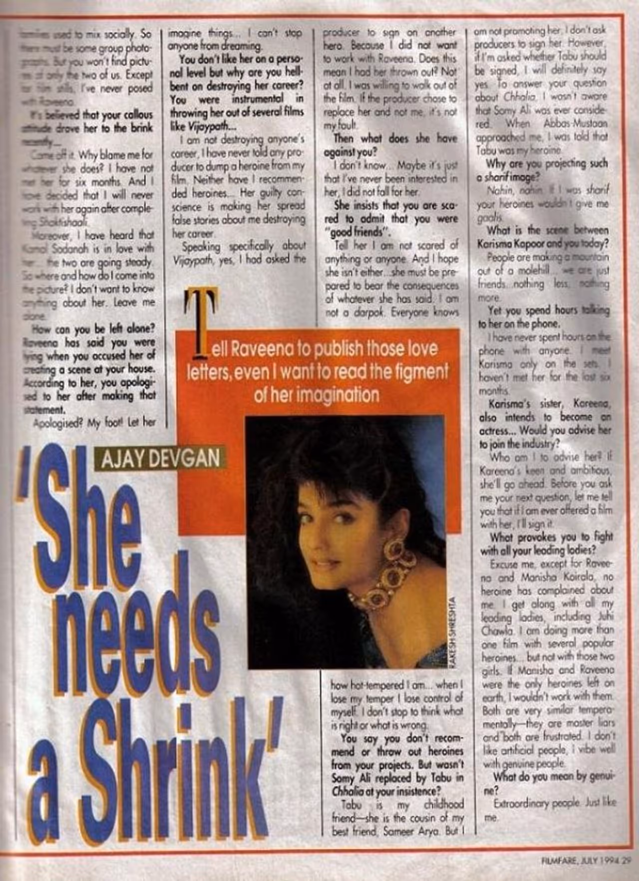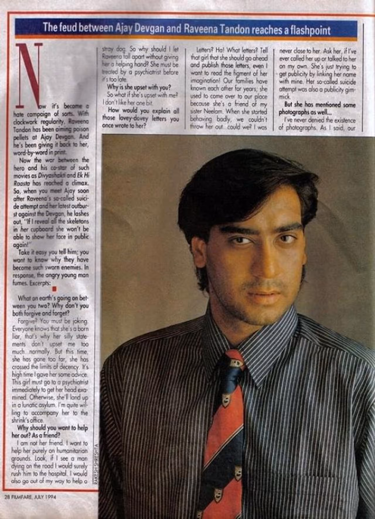 Ajay had advised Raveena to consult a psychiatrist after their ugly breakup. In an interview, Raveena said that they exchanged love letters while she was seeing Ajay, which she may use as proof of their romance. Ajay dismissed Raveena Tandon's charges as a 'figment of her imagination.' Ajay also talked about his relationship with Raveena Tandon in a 1994 interview with Filmfare, calling her a "born liar." He also suggested Raveen see a psychiatrist and have her head evaluated.