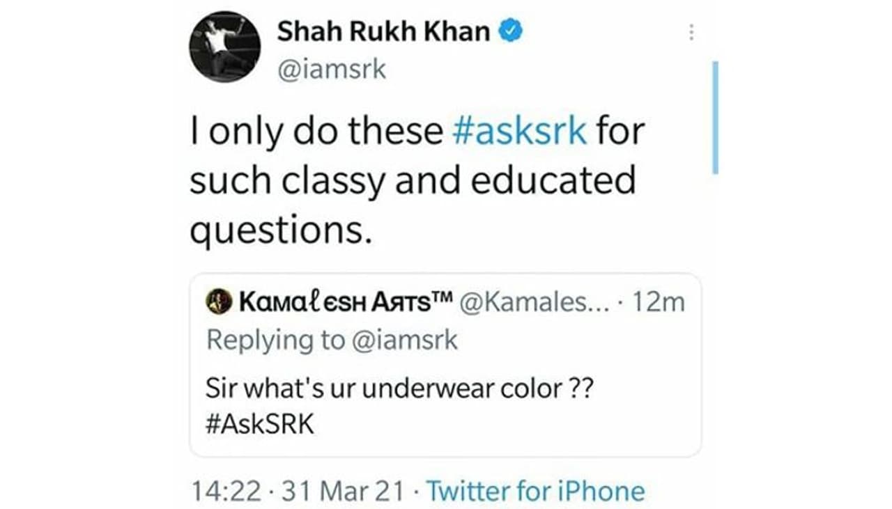He was asked about his underwear's colour. He replied, "I only do these #asksrk for such classy and educated questions." The person later deleted the question, but some people kept a screenshot.