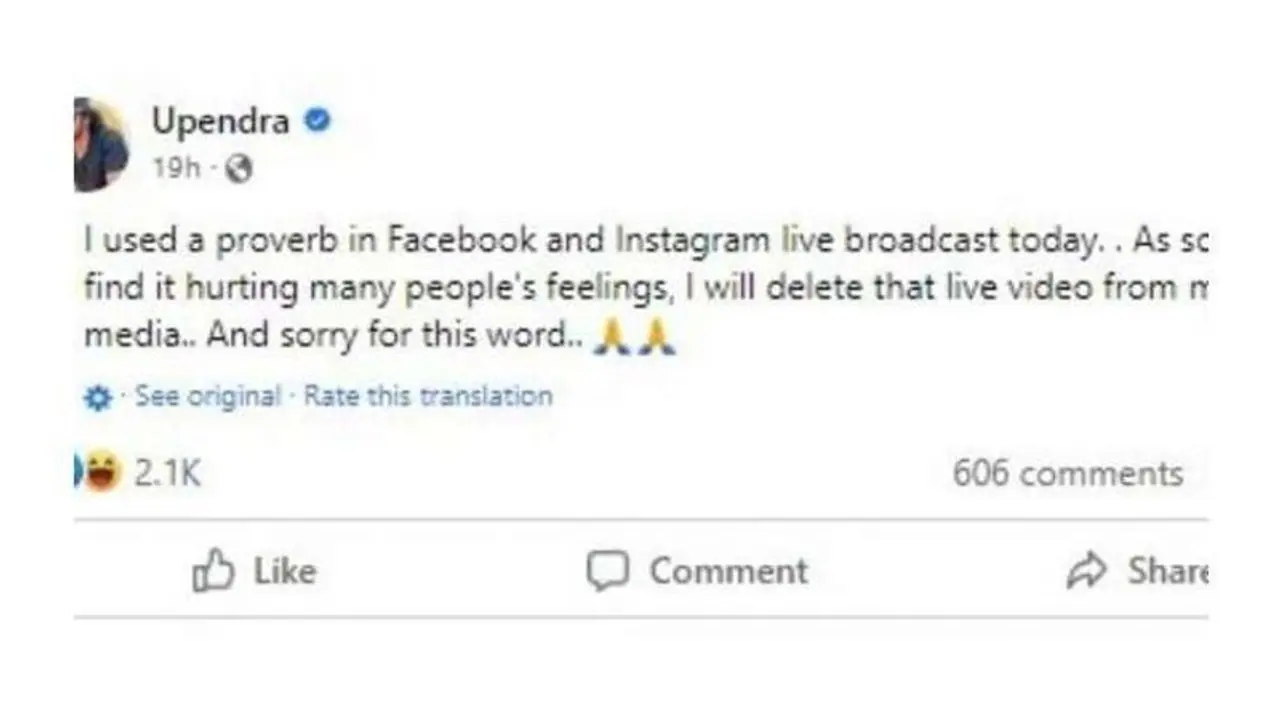 Following his remark, an FIR has been registered against the star. Upendra on Facebook and Instagram on the anniversary of his political party Prajaakeeya. Upendra said during the Facebook Live session, "Change can happen only with innocent hearts. I wish for innocent souls to join us and speak up. Their suggestions will benefit us. They won't speak carelessly or insult someone. Some have a lot of time on their hands. They comment on whatever comes to their mind. I can't do anything about them. If there's a town, it will have Dalits. Similarly, these kinds of people also exist. Let's ignore them. Let's not read those comments. Patriotism is when you love people.”