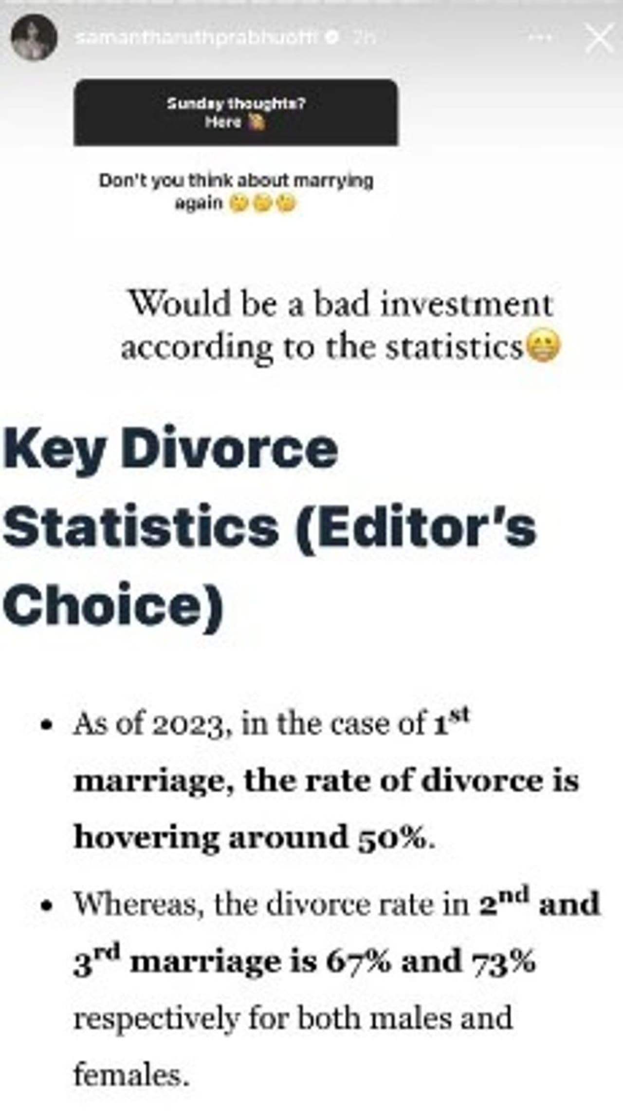 Samantha Ruth Prabhu spent time with her fans on Sunday (Dec 17), participating in an Ask Me Anything session on her Instagram Stories and responding to their queries. Taking advantage of the situation, an Instagram user questioned her anonymously, “Don’t you think about marrying again?” She said, adding a laughing emoji, “Would be a bad investment according to the statistics.” She also added the data on divorce rates in the post.
