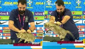 Brazil press officer left journalists shocked as he manhandled a cat that disturbed Vincius Jr's press conference ahead of their quarter-finals clash against Croatia at the Qatar World Cup 2022.