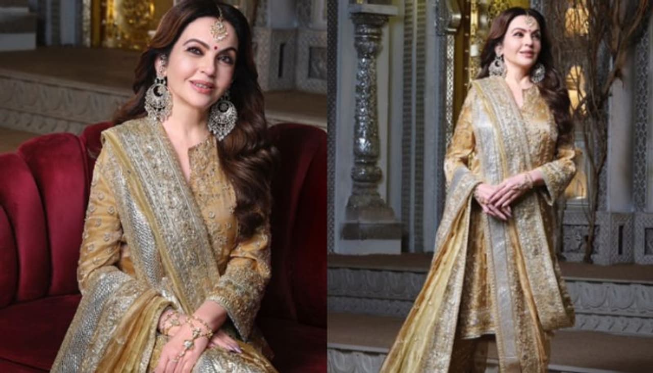 Nita Ambani was seen wearing a golden Manish Malhotra outfit during her son Anant Ambani's pre-wedding festivities.