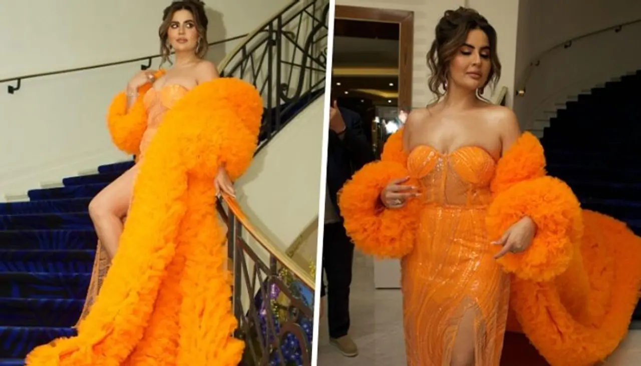 Deepti Sadhwani made a breathtaking debut in an orange gown with a record-breaking lengthy train that stunned the internet.