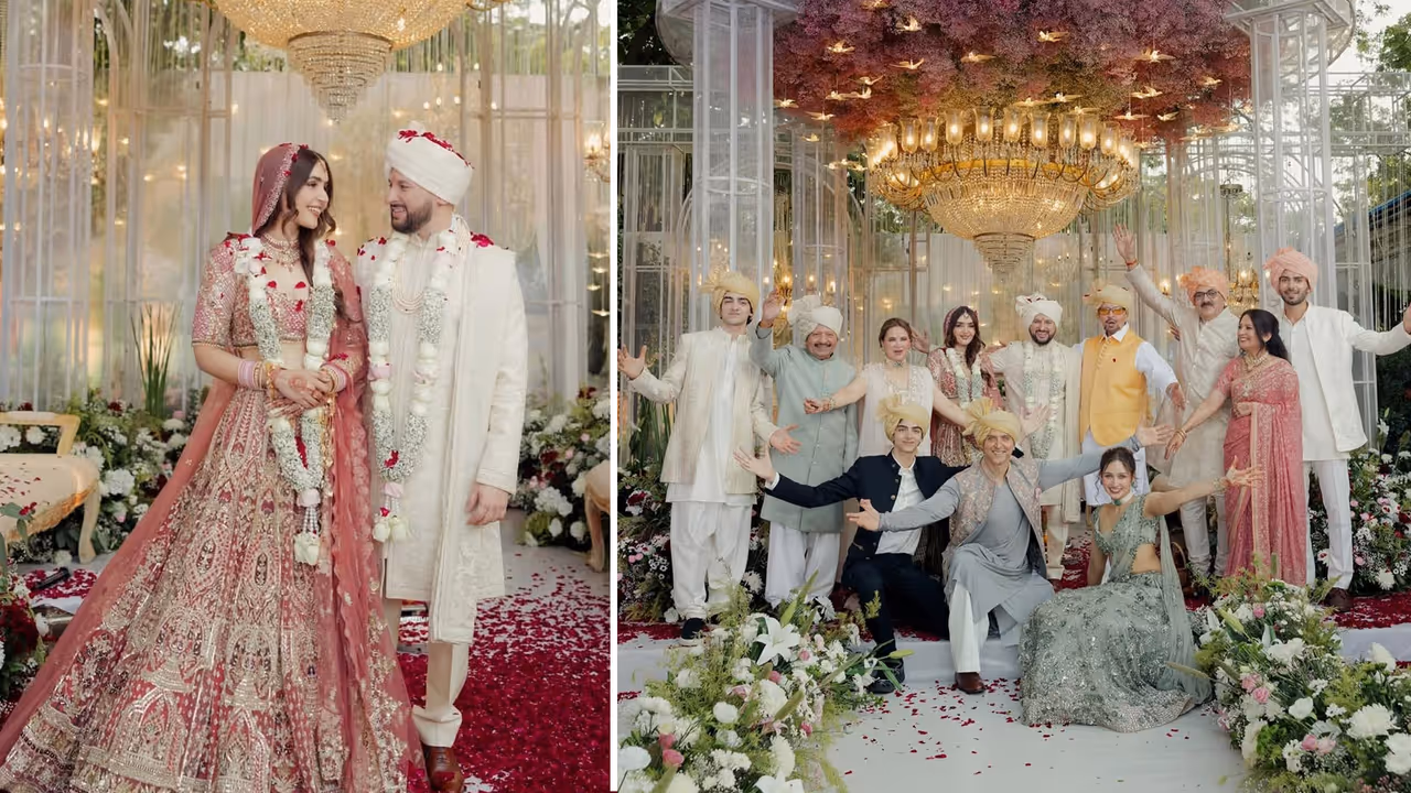 Hrithik Roshan's cousin Eshaan Roshan and Aishwarya Singh got married on December 23. The bride wore a heavy, dark carrot-colored lehenga, while groom Eshaan wore a cream-colored sherwani.