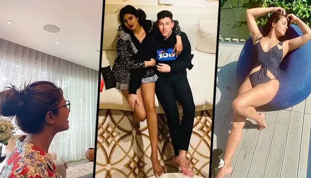 Priyanka was once seen in a cut-out swimsuit reclined on a blue bean bag for the sun-kissed click. We can also see one of her dogs' cute paws in the picture.