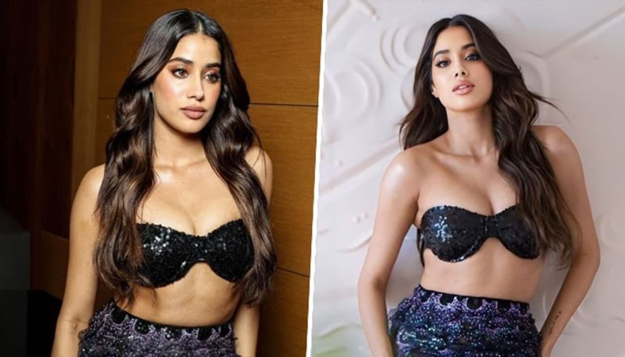 Janhvi Kapoor's outfit came with a dramatic train and holographic skirt, and black tube shimmer blouse.