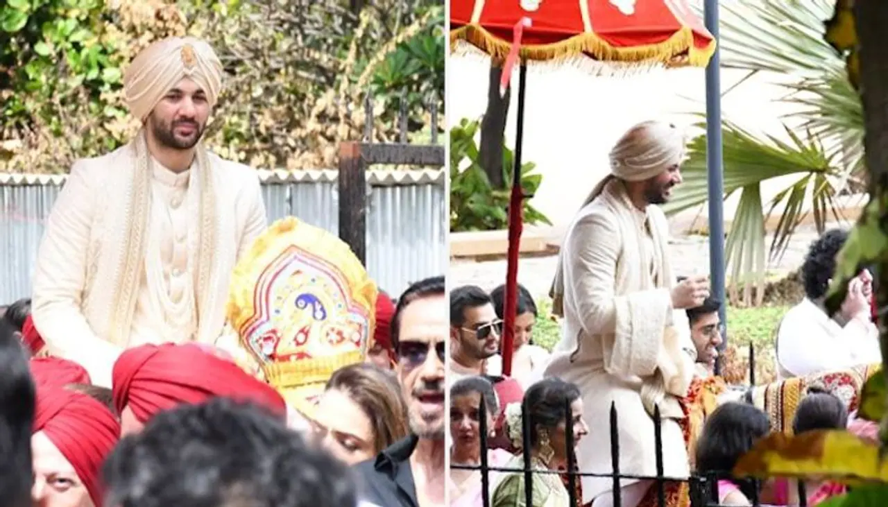 Karan dressed for the wedding with a cream sherwani and coordinating turban. Sunny Deol, Karan's father and an actor, was dressed for the event in a long green sherwani and white pyjamas.