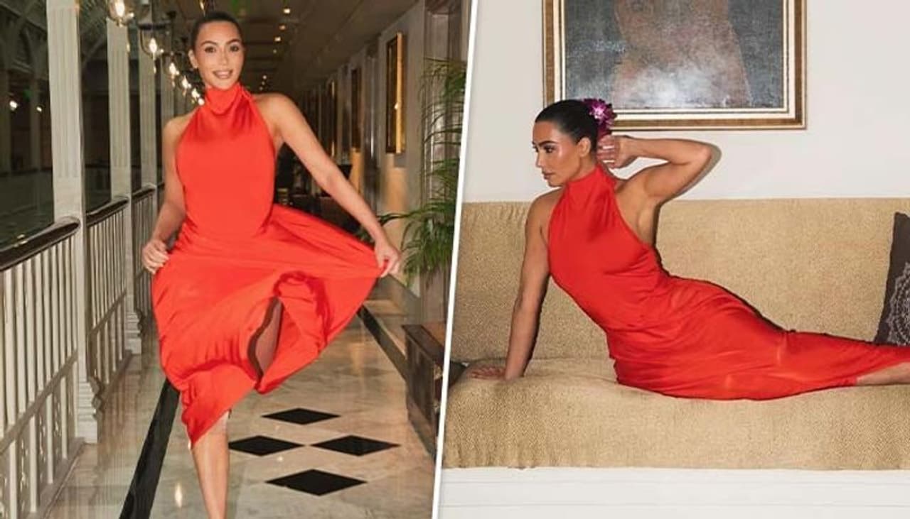 Kim can be seen in the images wearing a lovely satin silk halter-neck red tea-length dress, evidently enjoying her stay at the posh hotel. Sharing the pictures she wrote, 'Happy Place'.