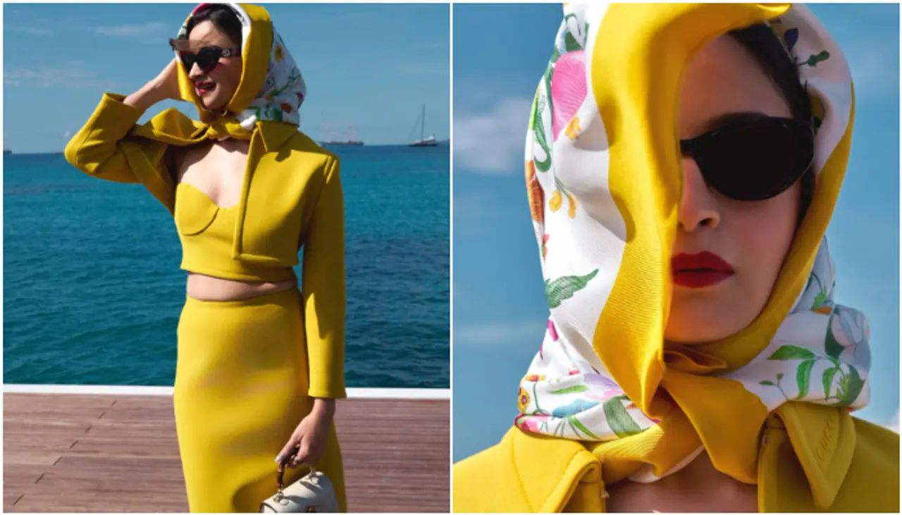 Alia Bhatt dazzled at Cannes 2025 in a lemon-yellow Gucci co-ord, channeling vintage Hollywood glamour with a retro scarf, red lips, and cat-eye shades—pure style inspiration!