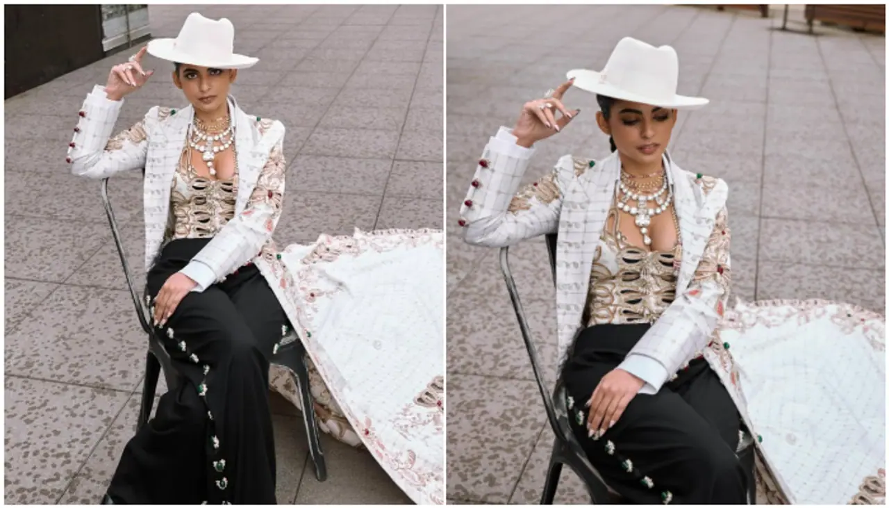 She wore a custom ensemble by renowned Indian designer Anamika Khanna, featuring a structured white geometric corset, sleek black tailored pants, and a flowing white cape.