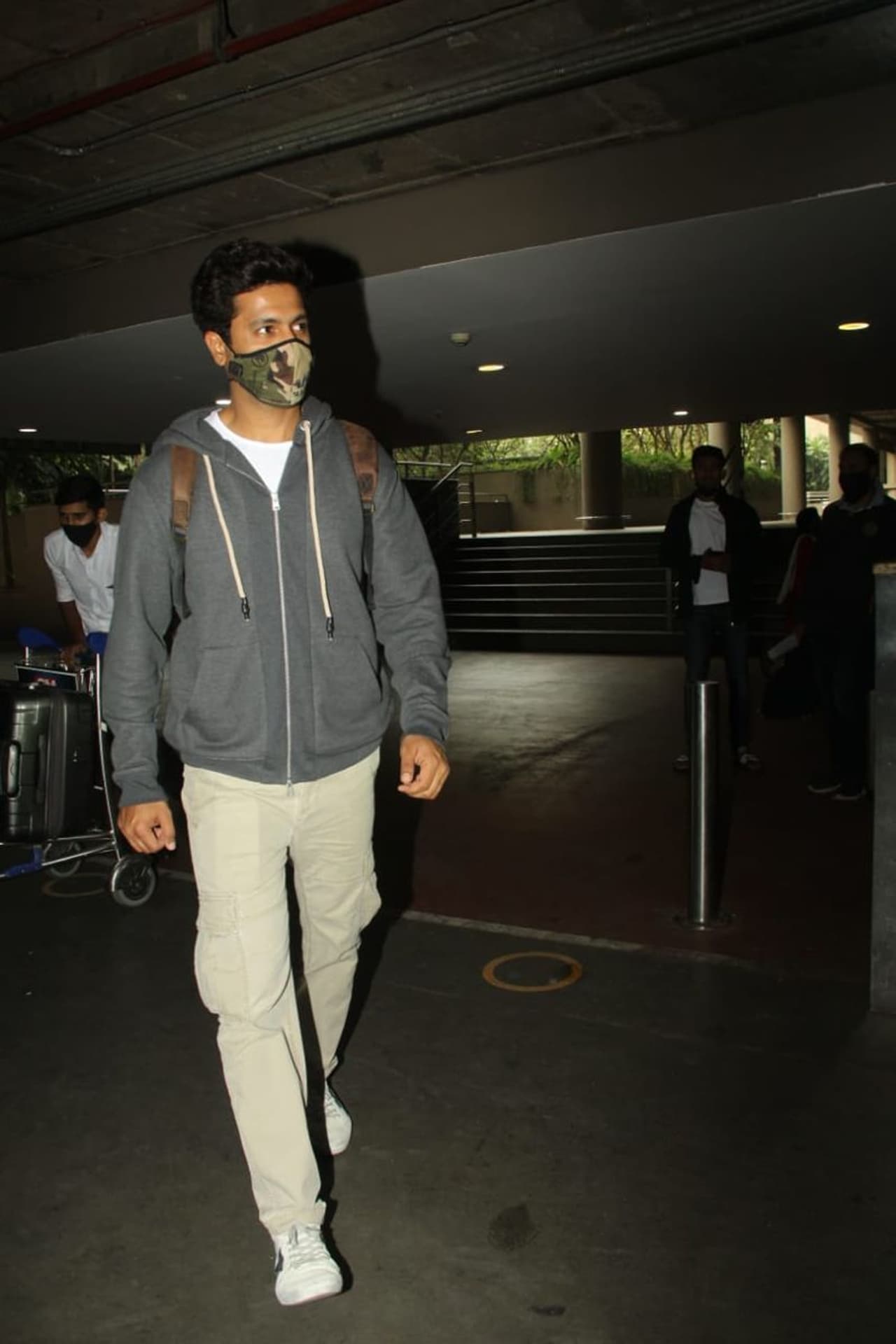 Vicky Kaushal took a small break from work to travel to Abu Dhabi. The ‘Sardar Udham’ actor returned to India on Tuesday, just in time, before Diwali. Upon his arrival in Mumbai, Vicky was greeted ‘Happy Diwali’ by the paps. He looked dapper as he left the airport, wearing a grey zipper hoodie with a white tee and beige pants.