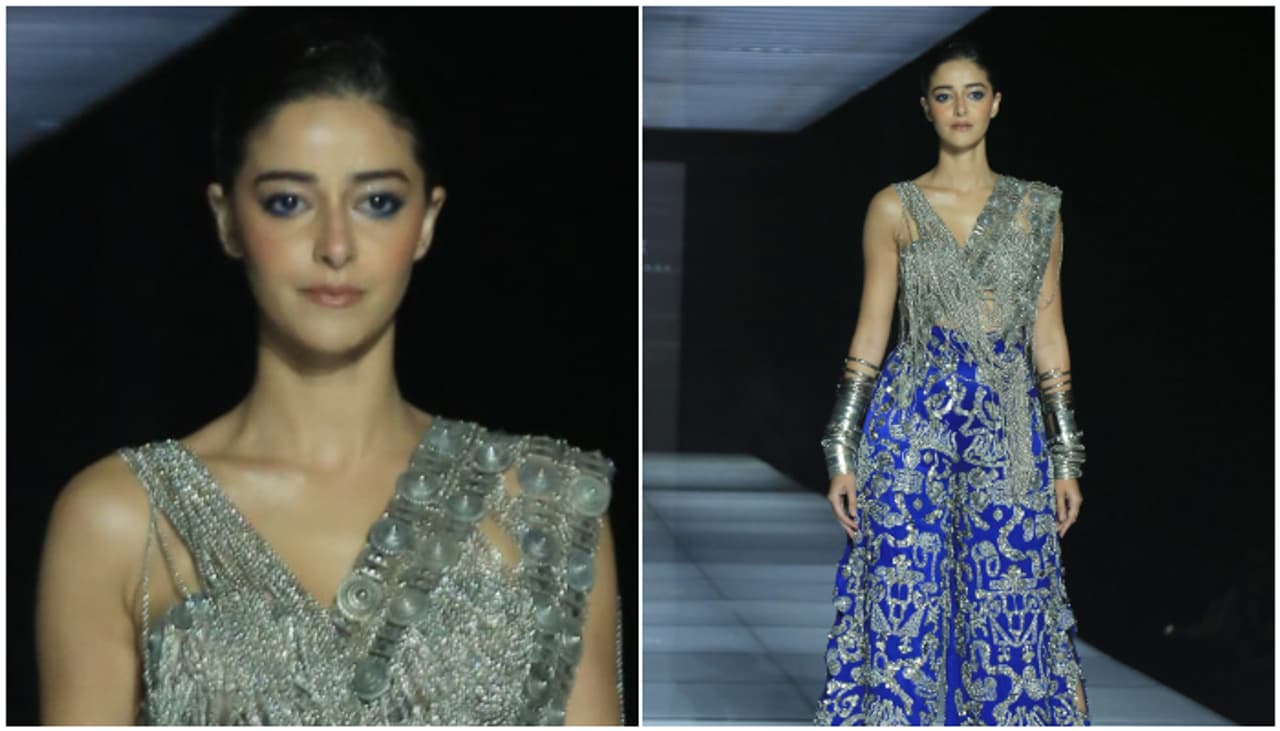 Ananya Panday made a striking appearance on Day 1 of the 25th Lakme Fashion Week, walking the ramp for designer Anamika Khanna’s ‘Silver Collar’ collection. She donned a bold silver and electric blue outfit that featured intricate embellishments, a deep neckline, and statement silver arm cuffs