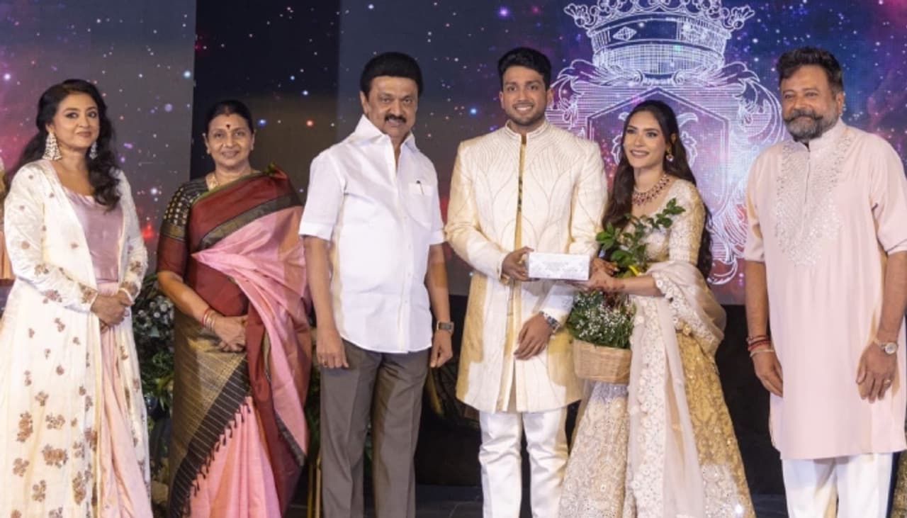 The wedding celebrations of actor Kalidas Jayaram, the son of renowned actors Jayaram and Parvathy, are currently the talk of social media. The couple's 'Sangeet' ceremony was held earlier in Chennai and was a star-studded affair, with Tamil Nadu Chief Minister M.K. Stalin and his family in attendance, along with actress Seema, director Vijay, and other notable figures.