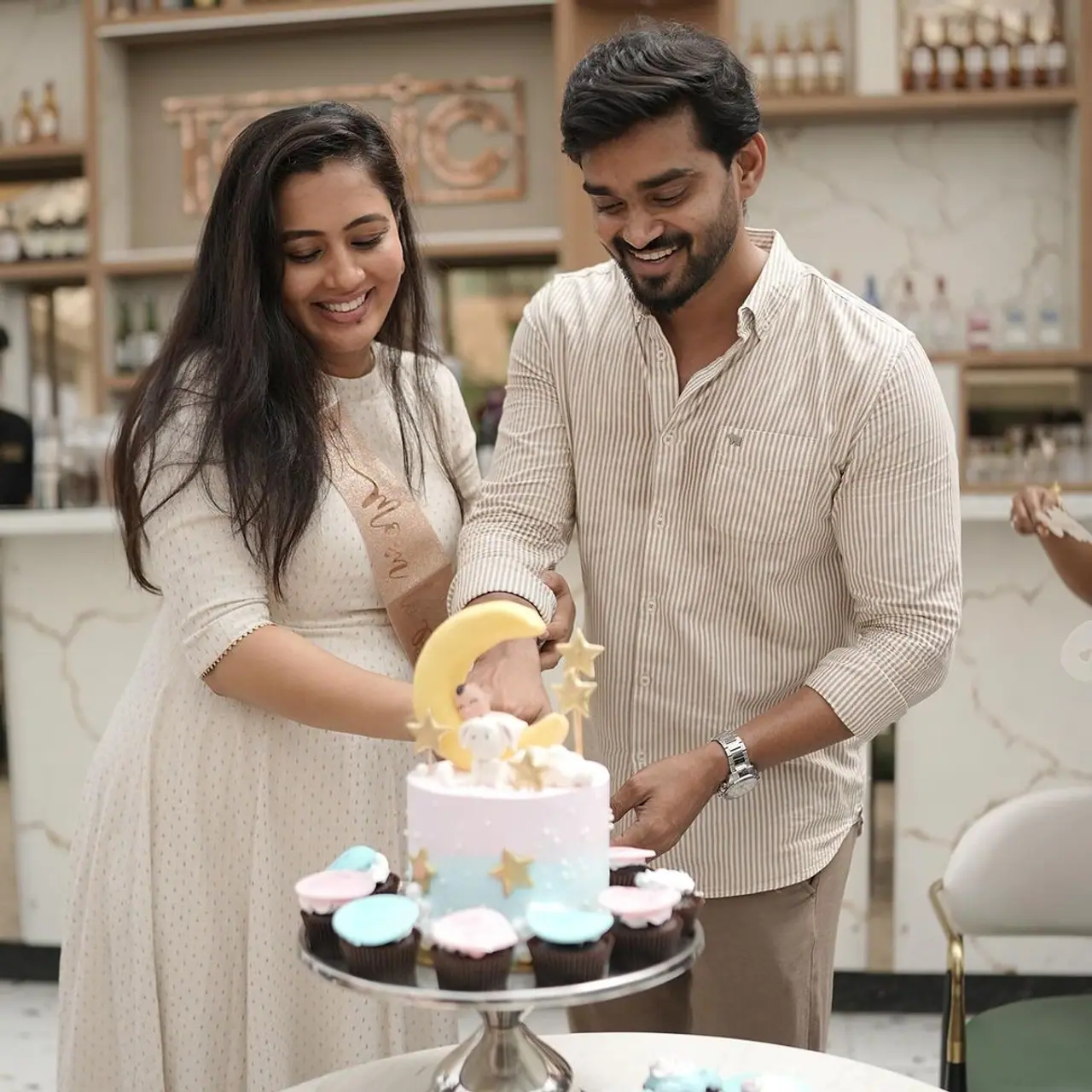 Neha Gowda also celebrated her birthday along with the baby shower and cut a cute cake of a baby sleeping on the moon.
