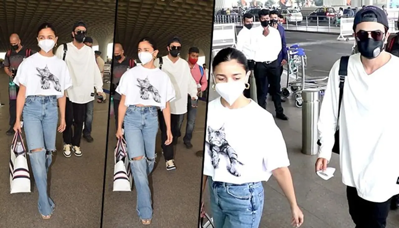 Alia Bhatt wore loose ripped jeans with a white-coloured cat print t-shirt. She tied her hair in a casual bun. Ranbir Kapoor also wore a white loose shirt with v neck and full sleeves and paired it up with black denim and a cap.