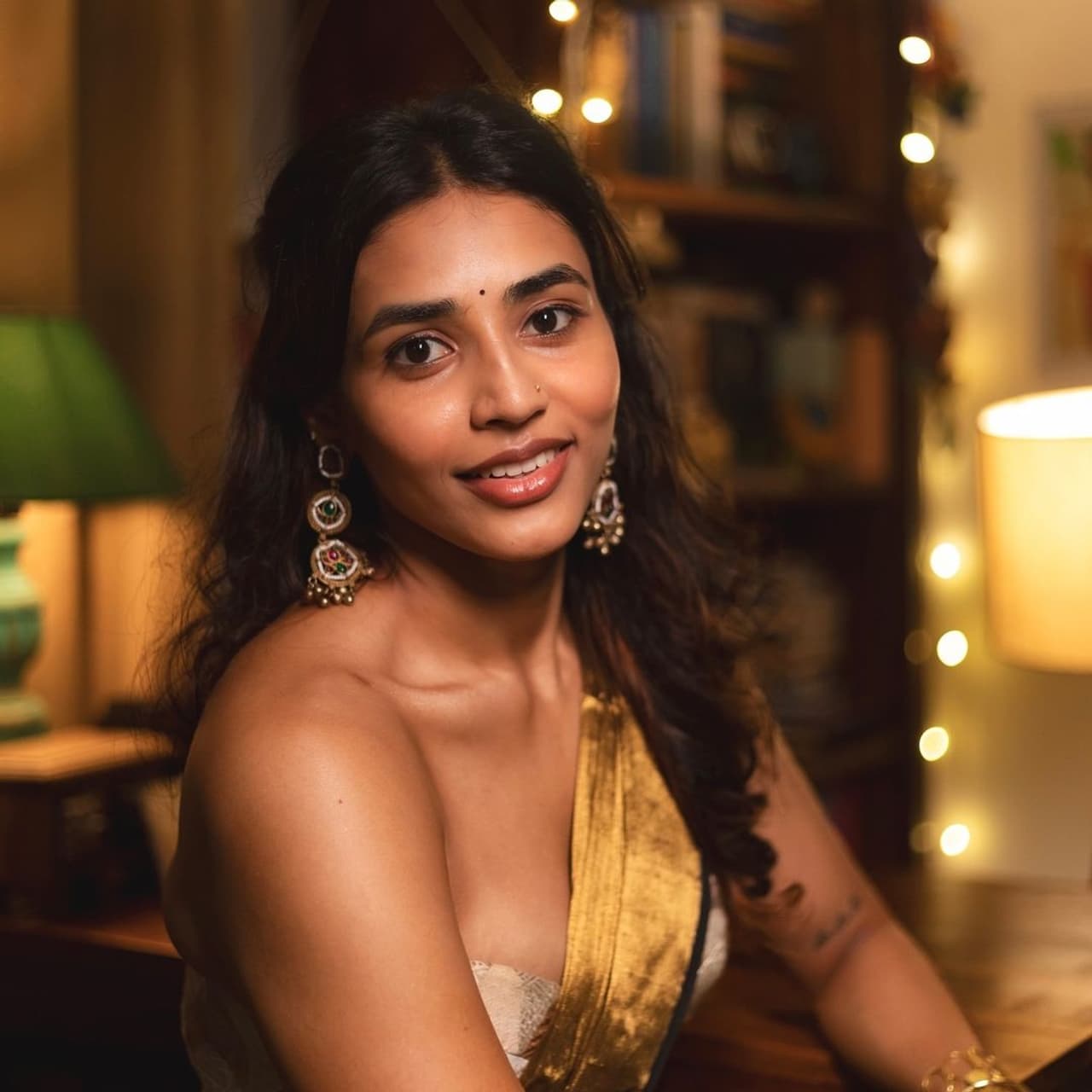 Sapthami Gowda wore a silver, white, and gold tube blouse with a golden saree, posing and smiling in various styles.