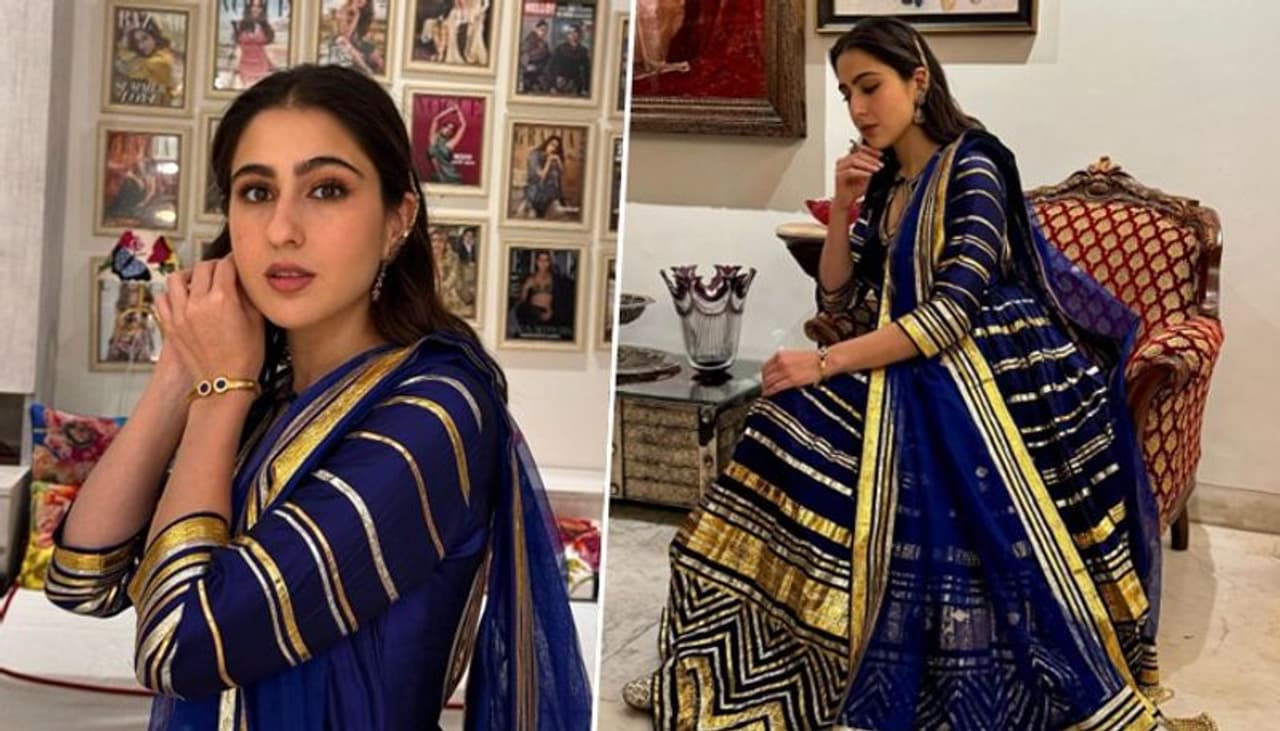 On for occasion, Sara dressed up for the celebration in a stunning Anarkali ensemble in shades of blue and gold.