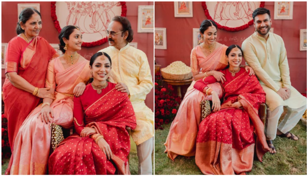 The photos showed Sobhita decked up in brigt red, and looked regal. She was dressed in a traditional saree and wore gold jewellery to complete the look. She posed alongside her sister and parents