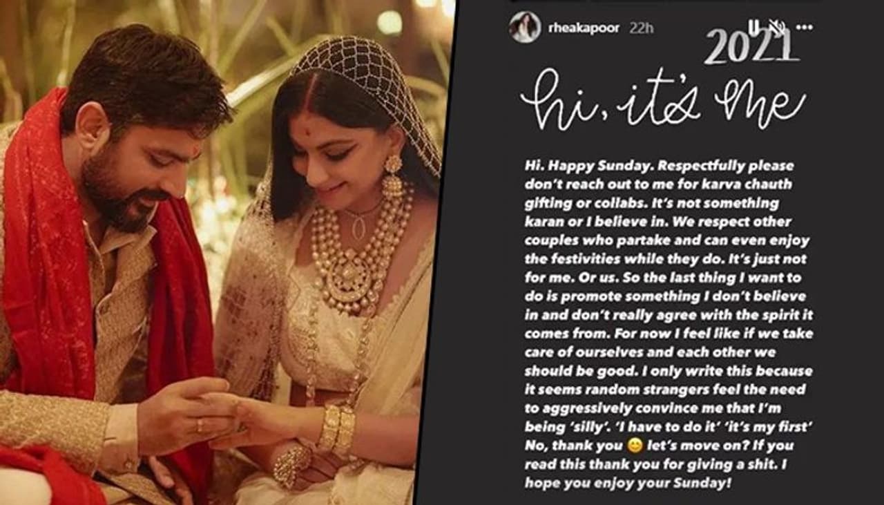 Rhea wrote, "Hi. Happy Sunday. Respectfully please don't reach out to me for karva chauth gifting or collabs. It's not something Karan or I believe in. We respect other couples who partake and can even enjoy the festivities while they do. It's just not for me. Or us. So the last thing I want to do is promote something I don't believe in and don't really agree with the spirit it comes from.”