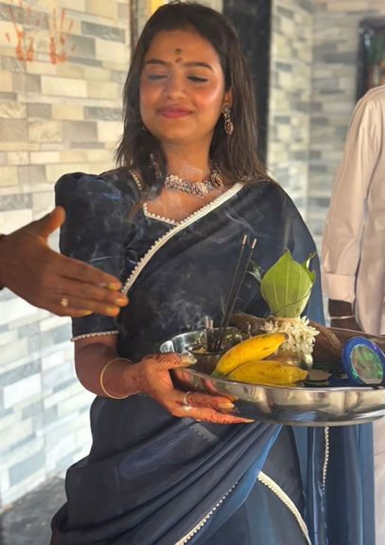 The festivities began on November 11 with Chappara Puja. The following day, Sonu, dressed in a blue designer half saree, participated in a pooja ceremony with her family at the entrance of the new home.
