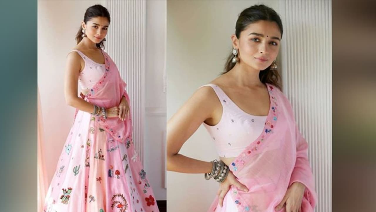Alia Bhatt wore a classic Manish Malhotra's sheer Royal blue coloured saree at her bestie's wedding shenanigans. The actress completed her look with a contrasting pink-stone choker, mang tika, and nude makeup. Looking very Indian and chic.