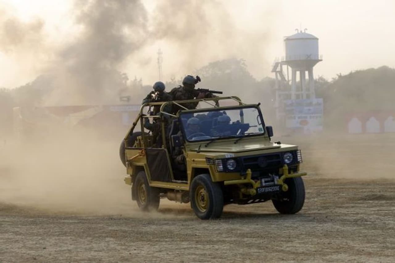 A team of eight paratroopers also showcased a combat free fall as they jumped out of a Dhruv helicopter, deployed their parachutes and manoeuvred down to land on the ground.