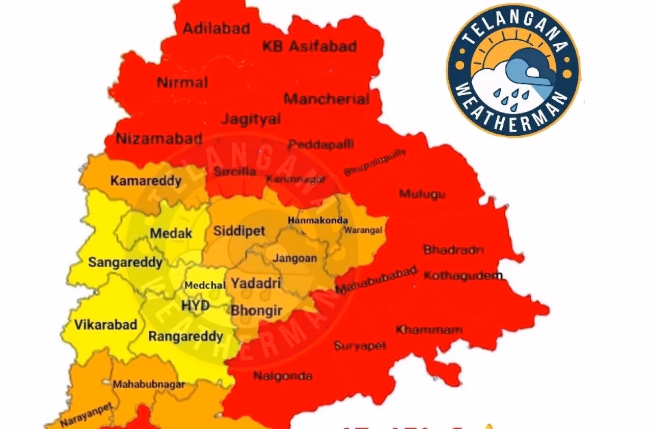 The Telangana Weatherman has revealed that the heat is going to get much worse. He warns that from April 24 to 29, temperatures will be the highest of the season so far. North and East Telangana districts are likely to feel like a furnace, so he has advised people to be careful. The Weatherman has issued three alerts based on temperature: a Red Alert for districts expecting 43-45°C, an Orange Alert for 42-44°C, and a Yellow Alert for areas with 41-43°C.