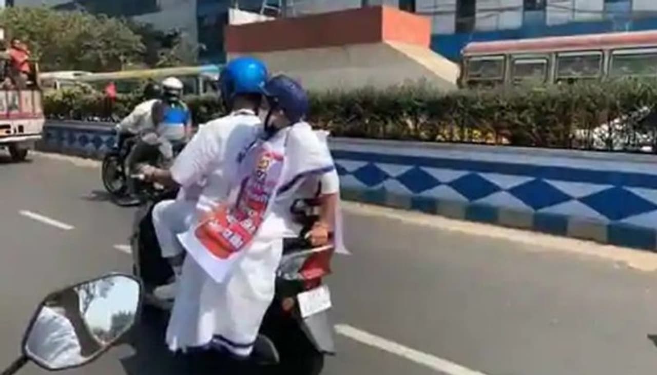 The CM was seen sitting behind state minister and Kolkata Mayor Firhad Hakim, who rode the battery-powered electric scooter. The two had blue helmets on their heads and protest posters around their necks.