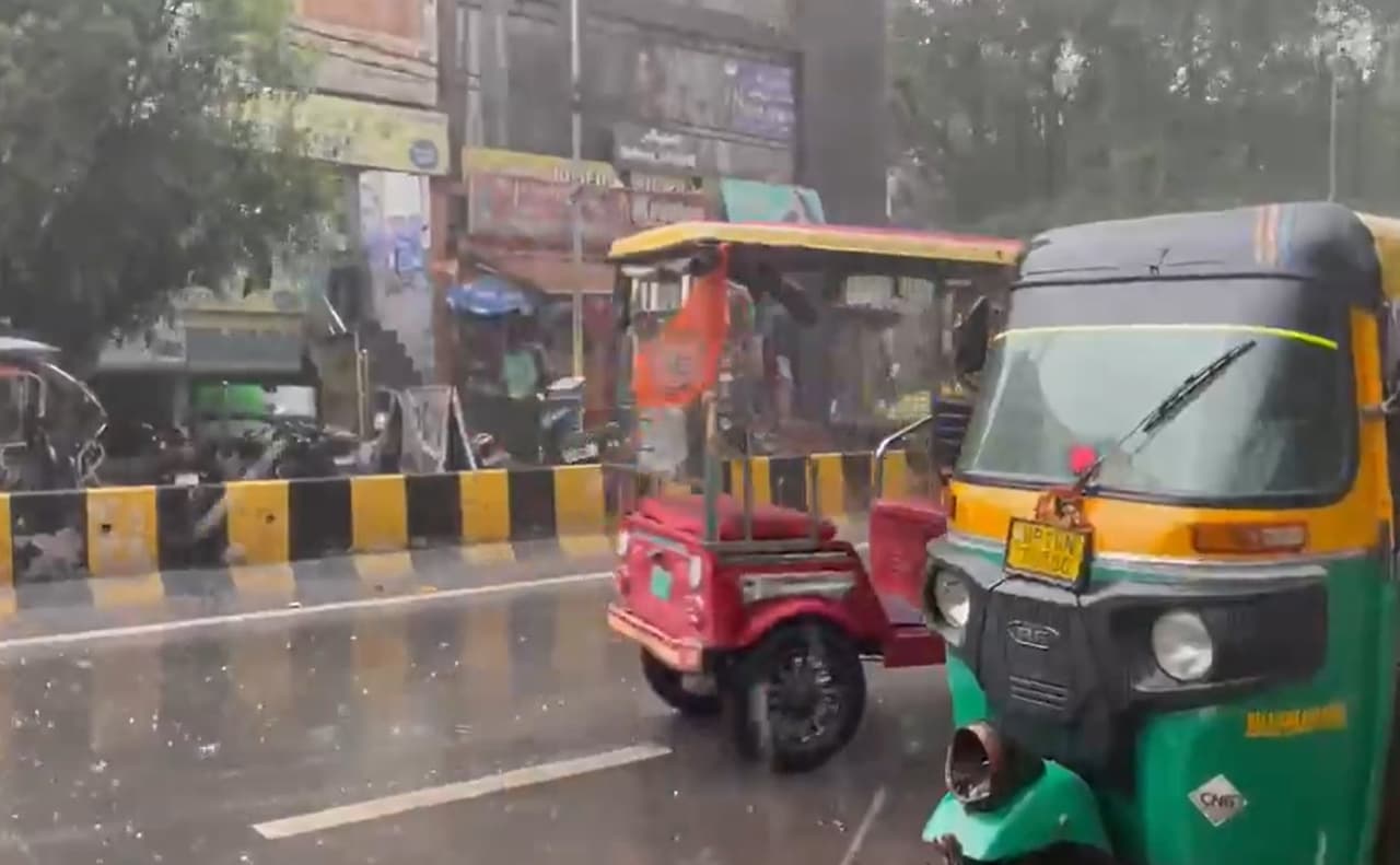 Delhi-NCR witnessed a dramatic change in weather on Thursday evening as rain, strong winds and hailstorm swept across several areas. After days of intense heat, the sudden downpour brought much-needed relief to residents.