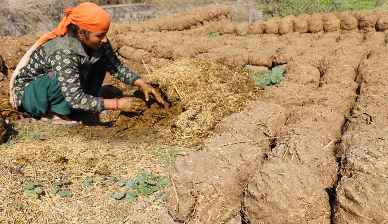 Creating a small compost heap by layering cow dung with kitchen and straw waste to enrich urban garden soil.