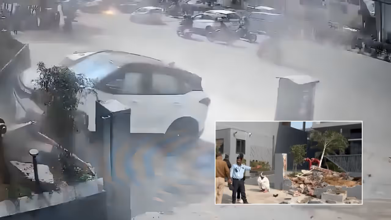 A dramatic video of the accident went viral on social media, showing a white Tata Safari crashing into the mall’s boundary wall at high speed.