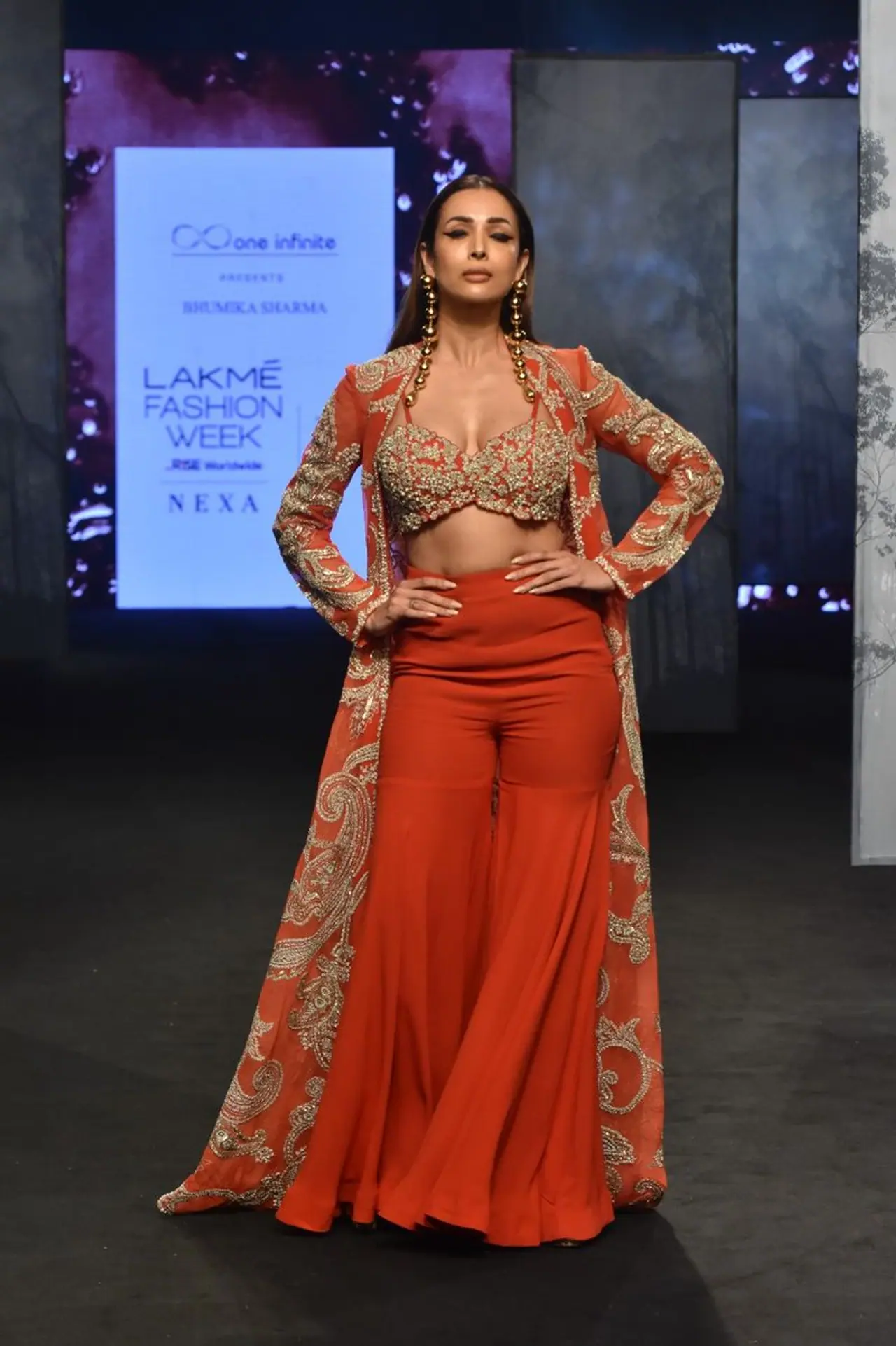 Malaika Arora took over the runway at the Lakme Fashion Week for designer Bhumika Sharma's latest collection Dahlia. The rusty-coloured attire worn by Malaika to close the performance included a bralette, sharara leggings, and a cape jacket. The bralette has straps, a plunging neckline, heavy embroidery, a fitted breast, and a cropped hem, while the trousers have a high waist and a fit-and-flare design.