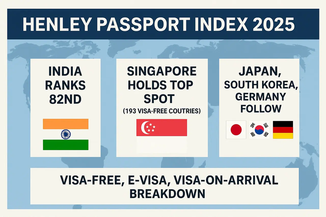 The Henley Passport Index 2025 ranks global passports by travel freedom. India stands at 82nd, while Singapore tops the list, offering visa-free access to 193 countries for the second year in a row