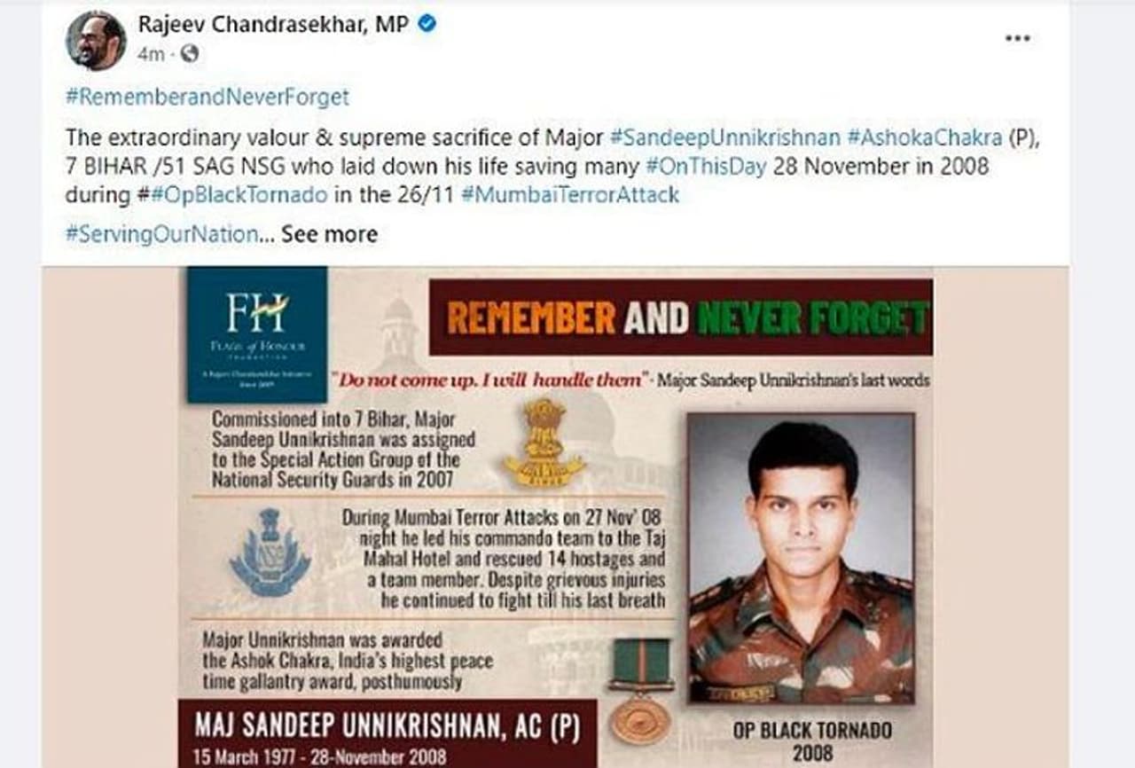 A granite slab was also erected at New Town in Bengaluru’s Yelahanka in Major Unnikrishnan’s memory. The board suffered damage in September 2018, which Rajeev Chandrasekhar termed as shameful and demanded that then government restore it to its former glory before the 26/11 attacks anniversary.