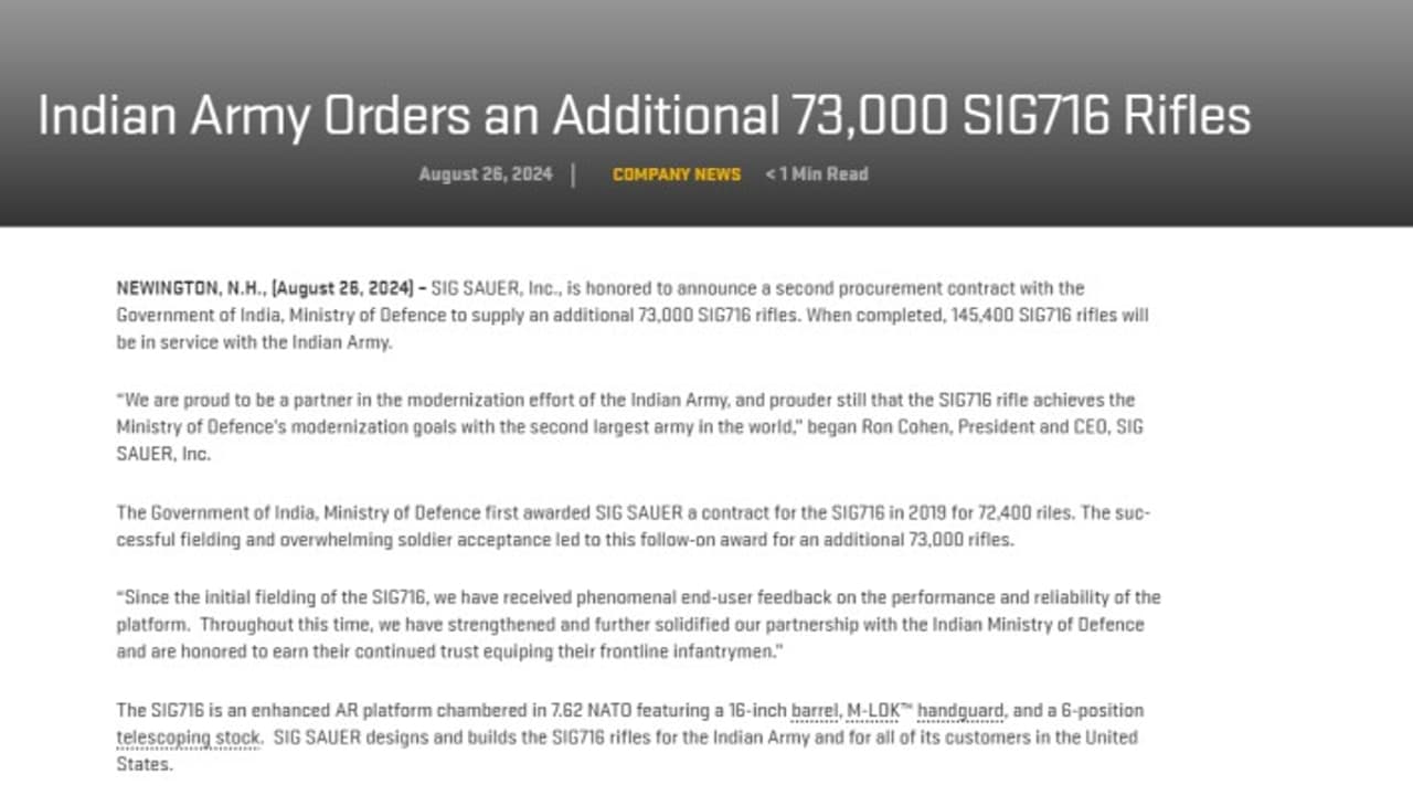 This order follows a previous one, bringing the total number of SiG716 rifles of 7.62 x 51mm caliber in the Army’s arsenal to 1,45,400 after the completion of this procurement. The announcement coincided with Defence Minister Rajnath Singh's four-day visit to the United States.