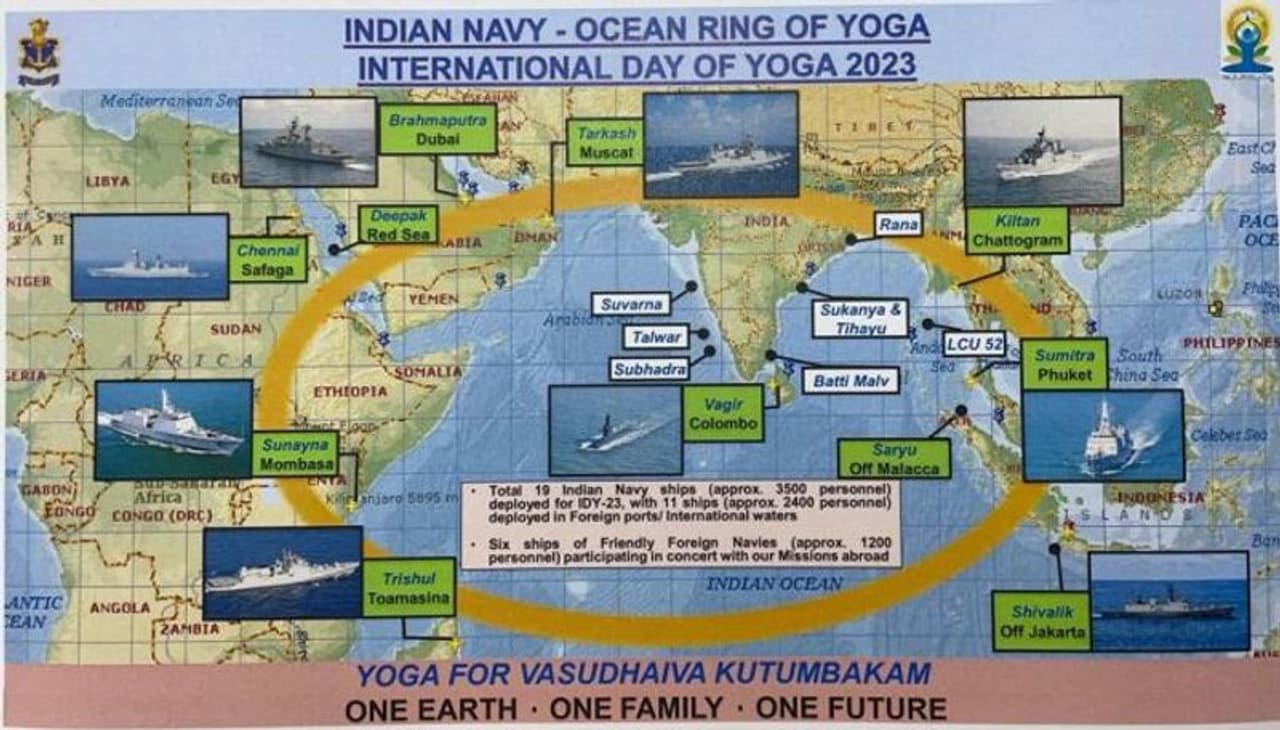 This year, the Indian Navy is wholeheartedly supporting the International Day of Yoga 2023 on a global scale, with planned port calls at Chattogram, Bangladesh; Safaga, Egypt; Jakarta, Indonesia; Mombasa, Kenya; Toamasina, Madagascar; Muscat, Oman; Colombo, Sri Lanka; Phuket, Thailand; and Dubai, UAE by Indian Navy Ships Kiltan, Chennai, Shivalik, Sunayna, Trishul, Tarkash, Vagir, Sumitra, and Brahmaputra respectively.