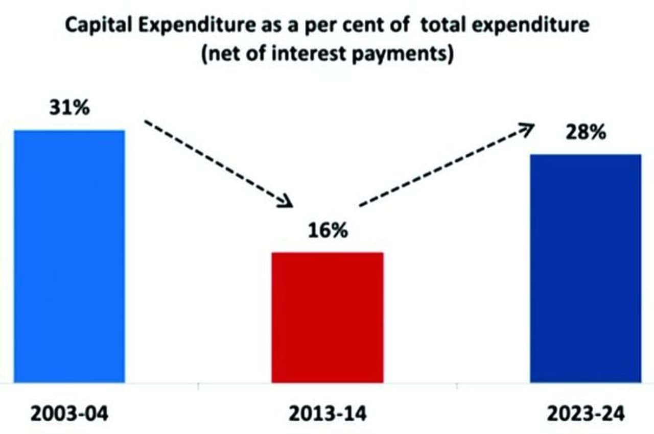 A noteworthy statistical revelation lies in the increase of investment capital expenditure, rising from 16 per cent during the Congress coalition government to an impressive 28 per cent under the Modi government. This significant surge reflects the government's commitment to driving economic growth and development through strategic investments and initiatives.