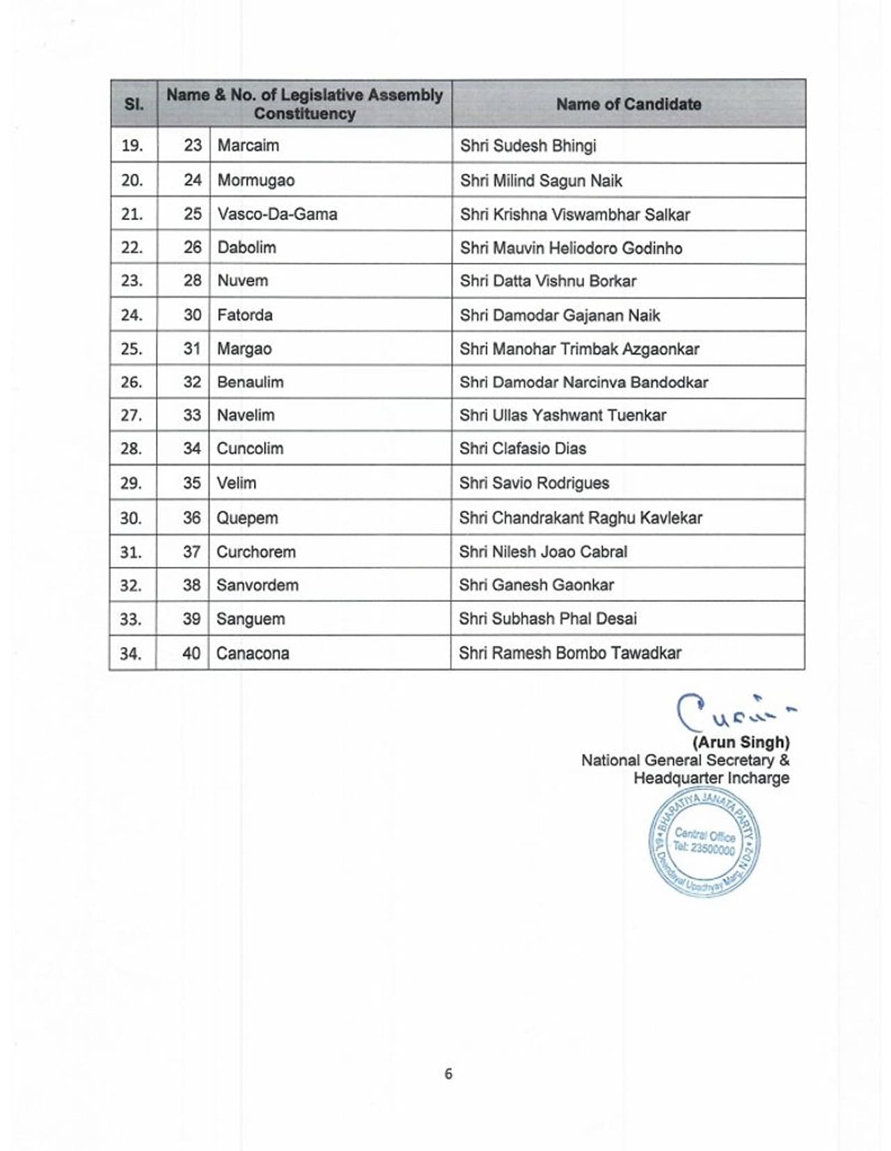 The list includes 34 candidates, which was announced by state poll in-charge Devendra Fadnavis and party general secretary Arun Singh. While briefing the media, Fadnavis said the BJP had ushered in a new era of development in Goa over the last ten years while also ensuring stability.