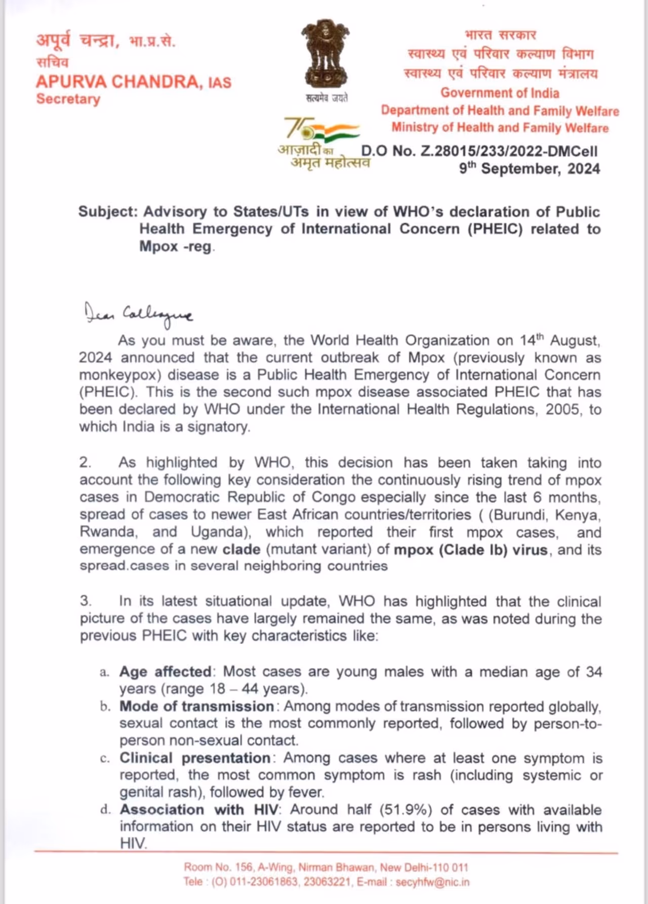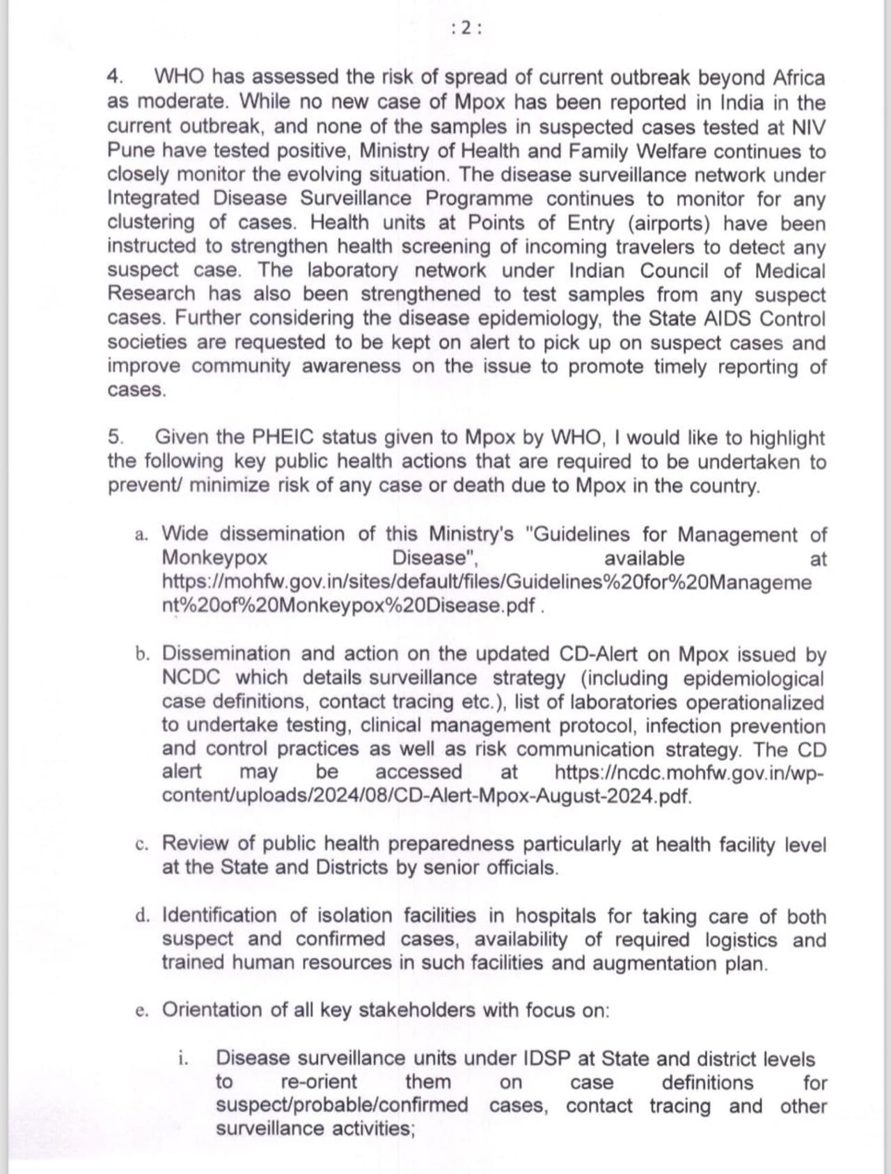The ministry further called for a "review of public health preparedness, particularly at health facility level at state and districts by senior officials". This should include briefing healthcare workers, "especially those working in skin/STD (sexually transmitted disease) clinics, about symptoms, differential diagnoses, and action to be taken following detection of a Mpox case".