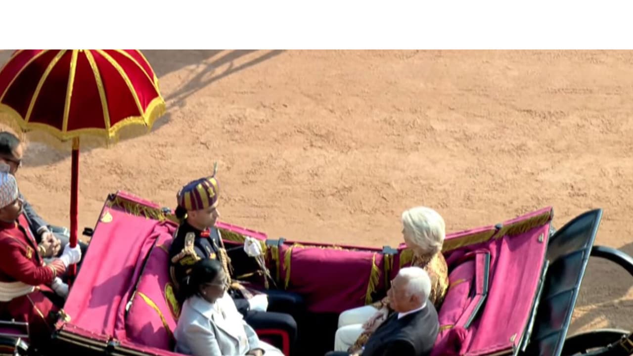 President Droupadi Murmu arrived at Kartavya Path in a ceremonial buggy for the 77th Republic Day. She was accompanied by EU leaders as chief guests and escorted by the President's Bodyguard. The celebrations also featured the 21 Gun Salute.