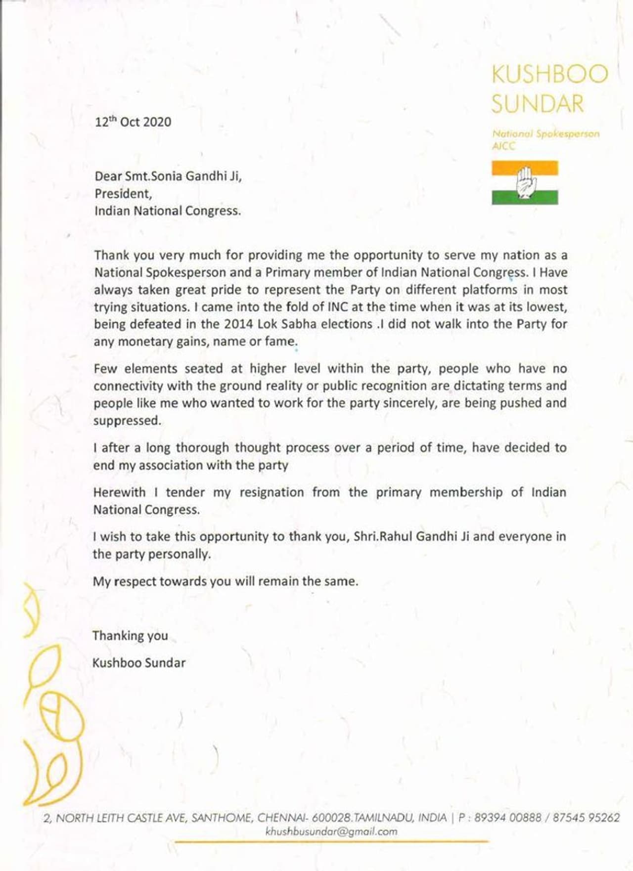New Delhi: Amid speculation that actor-politican Khusbu Sunday may join the BJP later today (October 12), she tendered her resignation to Congress president Sonia Gandhi.