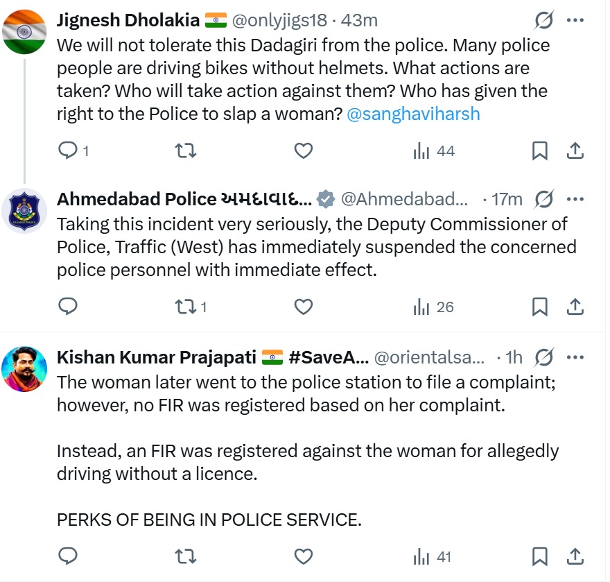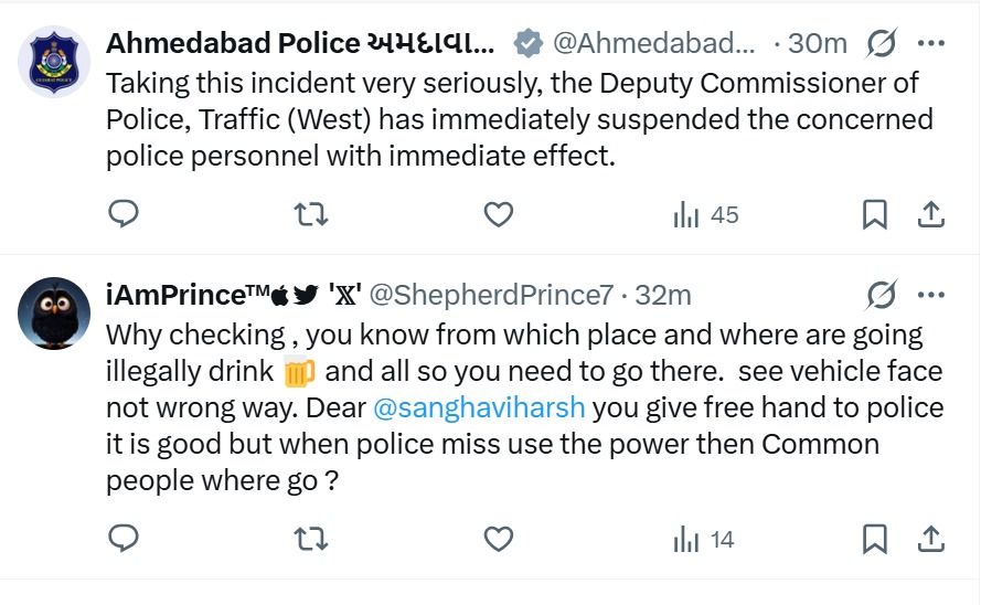 Amid the backlash, Ahmedabad Police responded publicly on X. The department said the Deputy Commissioner of Police, Traffic (West), took the incident 'very seriously' and suspended the concerned police officer with immediate effect.