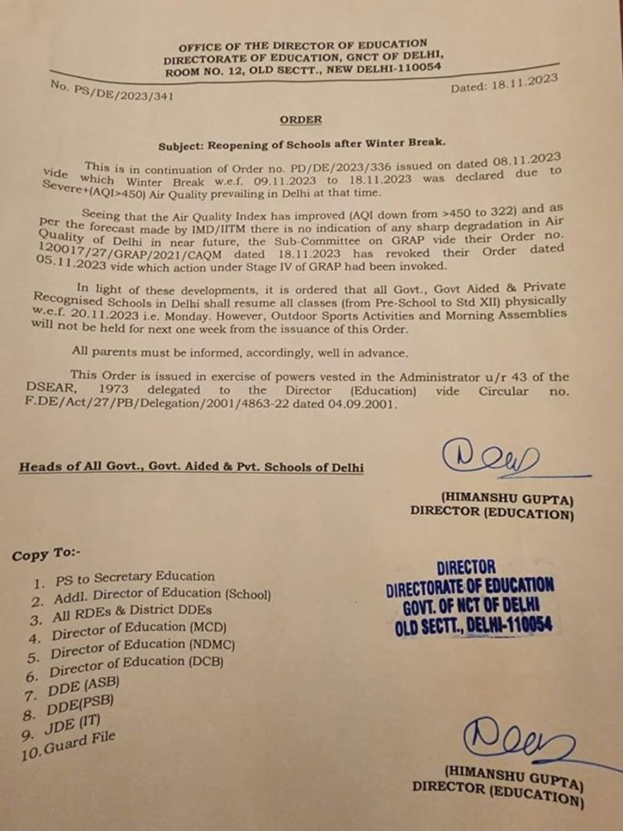 All schools in Delhi are set to reopen from Monday, November 20, as the Air Quality Index (AQI) has shown improvement, and there is no imminent indication of a sharp decline, according to a government order issued on Saturday. The decision comes as the Sub-Committee on Graded Response Action Plan (GRAP) revoked its order invoking Stage IV of GRAP, citing improved air quality and favourable forecasts from the India Meteorological Department (IMD) and the Indian Institute of Tropical Meteorology (IITM).