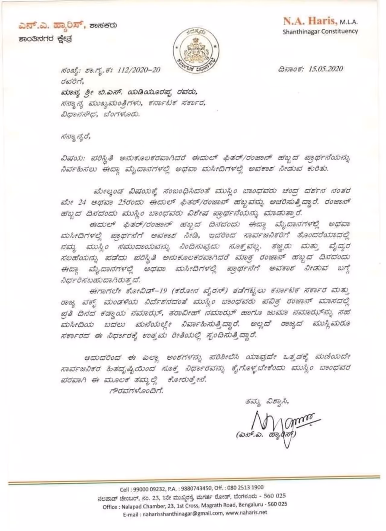 MLA NA Haris has written a letter to the chief minister of Karnataka requesting the state government to allow Muslims in the state to offer Eid prayers at mosques with all precautionary measures in view of COVID-19