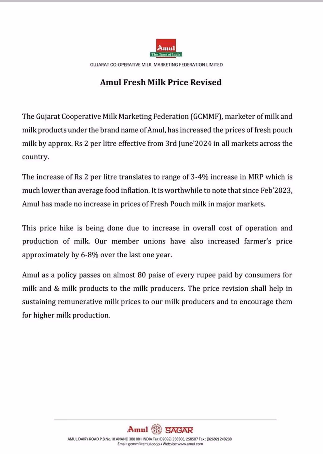 The price of fresh milk was raised by Rs 2 per litre in all markets nationwide as of June 3, 2024, by the Gujarat Cooperative Milk Marketing Federation (GCMMF), which sells milk and milk products under the Amul brand.