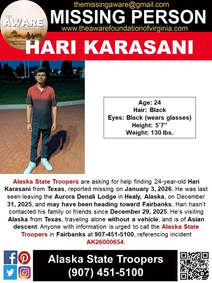 Hari left for Alaska on December 22 and was travelling alone using public transport. He last contacted his friends and family on December 30. Since then, there has been no communication from him, raising serious concern.