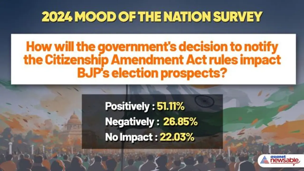 An overwhelming 51.1 per cent of the respondents believe that the Narendra Modi government's decision to notify the Citizenship Amendment Act rules will positively impact the BJP's election prospects. While 26.85 per cent of those who took the digital survey believed that the decision on CAA would negatively impact the BJP in the Lok Sabha election, 22.03 per cent felt there would be no impact on the party's performance in the hustings. Curiously, 48.4 per cent of the respondents from Tamil Nadu believed that the decision to notify CAA rules would have no impact on the BJP's election fortunes.