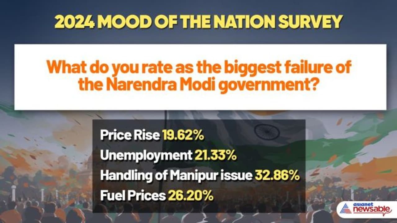 When asked about what they would rate as the biggest failure of the Narendra Modi government, 32.86 per cent of respondents slammed the handling of the ethnic violence in Manipur involving the Kuki-Zo tribes and the Meiteis over disputes pertaining to land, resources, political representation, and affirmative action policies. The nine-month-long violence has resulted in the loss of over 180 lives and the displacement of 50,000 individuals internally. Other issues which respondents termed as the biggest failures of the Modi government included soaring fuel prices (26.2 per cent), unemployment (21.3 per cent) and inflation (19.6 per cent). The survey found unemployment (36.7 per cent) to be the biggest concern for respondents from the Hindi heartland while voters in Tamil Nadu picked price rise (41.79 per cent).