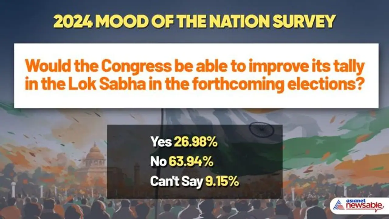 More worrying prospects lie ahead for the Congress, which has, in recent weeks, seen a spate of resignations. The Mood of the Nation survey reveals that 54.76 per cent of the respondents believe that former Congress president Rahul Gandhi's Bharat Jodo Nyay Yatra will not improve the party's prospects in the forthcoming Lok Sabha Election 2024. Just 38.12 per cent of the respondents believed that the Congress tally could improve due to Gandhi's Nyay Yatra.